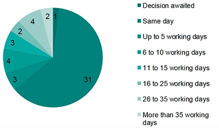 179. Chart 5 shows the time taken for initial decisions to be made. In 31 cases (62%), initial decisions were taken on the same day the police report was received, 30 of which were custody reports and one of which was an undertaking. The remaining cases were either warrant requests, undertakings or reported cases.